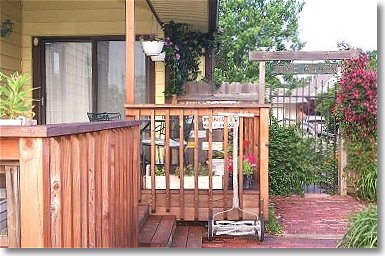 Sign hanging over gate is one that my daughter and I made out of a 2x6 and twigs. On one side it reads "Welcome", on the other "Come again". Growing up and over the gate is clematis.