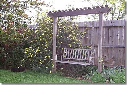 The story is that the rose behind this swing is a start from one that was brought to Kansas from Montana by my ancestors when they homesteaded here.
